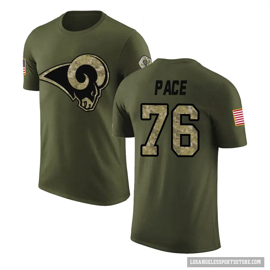This Men's #76 Orlando Pace Los Angeles Rams Olive Salute to Service T-Shirt features a military-inspired color scheme, complete with an American flag and Salute To Service graphics on the sleeve. The crisp Los Angeles Rams graphics and camouflage details will add some much-needed spirit to your game day collection.